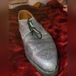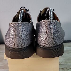 Amazing vintage Na Na Docs Dr. Martens Oxford creepers in grey with printed pattern in black, sort of like square feathers.