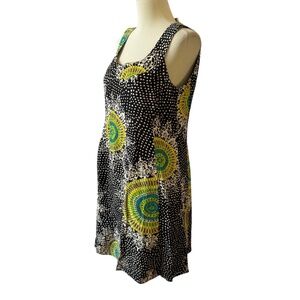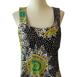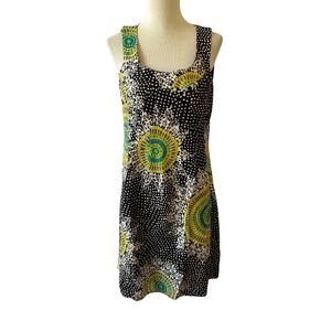 Size 8, black, white, green and yellow abstract print, back zipper, sleeveless, sheath or shift style.