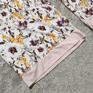Pretty MultiColor floral printed pajama pants from Nanette Lepore. Lightweight and stretchy material. Elastic waist. Dark plum and gold flowers on off-white background with a soft pink trim hem make it easy to coordinate different colors with it.