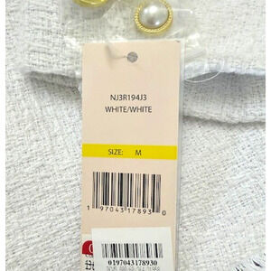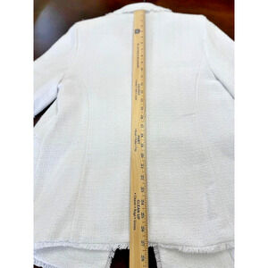 The NANETTE LEPORE Frayed Tweed Texture Plaid Jacket Blazer in size LARGE is a stylish and versatile piece that can be worn year-round. Made of polyester with a denim fabric type, this mid-length blazer features a white plaid pattern with fringe accents, giving it a unique and trendy touch. With pockets and an open front, it is perfect for layering and can be dressed up or down for various occasions, whether it be a holiday gathering, a day in the city, or a classic and preppy event. The Nanette Lepore brand adds a touch of designer flair to this wardrobe staple.