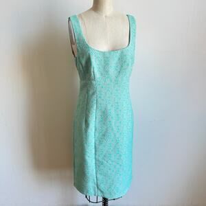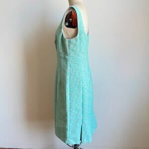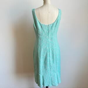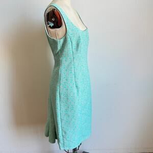 Details: NANETTE LEPORE Lost In Love matching demure tweed sheath dress + jacke in mint green & grey tweed. The structured sheath dress is seamed to figure-flattering perfection with a pleated back hem, square neck. Sleeveless, empire waist, front & back princess seams, and a scoop back. Concealed back zip. Inverted pleats at back hem. The collarless jacket zips down the front with matching pleats at the hem and small slit pockets. Fully lined.