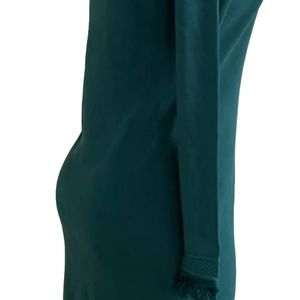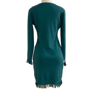 Elevate your wardrobe with the NANETTE LEPORE Luciana Knit Fringe Trim Sweater Dress. This stunning dress features a gorgeous dark green color called "Night Garden" and is adorned with fringe trim on the sleeves and hem for a stylish touch. Crafted from a highly stretchy blend of 70% viscose and 30% nylon, this dress offers both comfort and style. It is unlined but thick, ensuring warmth and coverage. With approximate flat measurements of 18” pit to pit, 15” waist, 18” hips, and 38” shoulder to hem, it offers a flattering fit. Brand new with tags and no flaws, this dress is perfect for adding a touch of elegance to any occasion.
