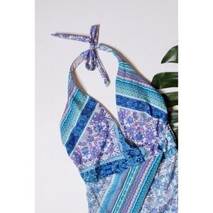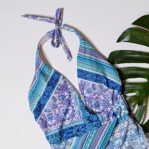 Surplice or crossover style front creates a plunging V neckline ~ Adjustable halter style ties that tie on the back of the neck ~ Optional/Removable soft molded padding/cups in bust ~ Draped band at waistline with an offset square metal ring ~ Moderate coverage on backside ~ Fully lined ~ Mixed watercolor looking prints ... floral and stripe patterns in various shades of white, aqua, green, pink & purple