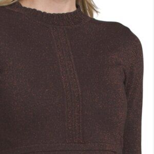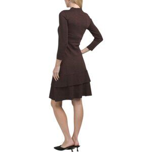knit construction, ribbed trim, metallic accents, tiered hem, collar detail