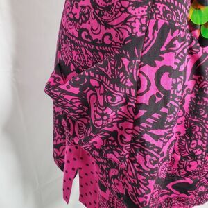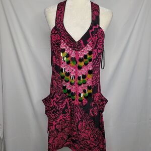 Luminous dress in fuchsia multi by Nanette Lepore. This V-neck, racer-back print silk dress features assorted, faceted transparent beads and two-tone paillettes at the bib. 12 hook-and-eye closure and pleats at front. Draped slant pockets at hips and polka-dot banding at 3.5" side slits. 1.75" straps. Lined. Taylor Swift tour.