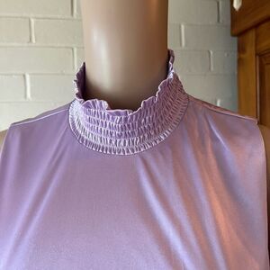 Smocked neck and waist, three button closure in back of neck, satin, sleeveless, fully lined, color orchid bloom