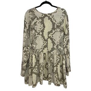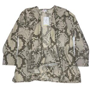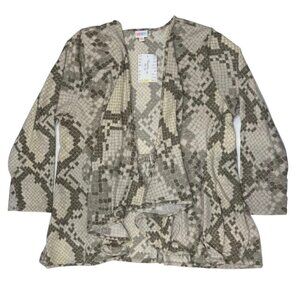 NANETTE ~ LuLaRoe ~ Women's open cardigan / cover up with waterfall lapels. Size 3XL. Neutral grey and white snakeskin pattern in warm, fuzzy fabric. Super soft and stretchy. Gathered waistline in back. Long sleeve. Comparable size 22W/24W.