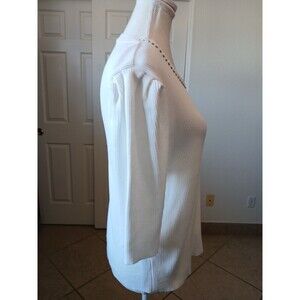 The NANETTE Nanette Lepore Jewelneck White Ribbed Elbow Sleeve Sweater in size Large is a stylish and versatile piece suitable for various occasions. Made from a blend of 70% Rayon and 30% Nylon, this knit sweater features a crew neck and puff sleeves, adding a touch of elegance with beaded and rhinestone accents. The solid white color and formal style make it perfect for workwear or business attire, while the hand wash only garment care ensures longevity. This sweater is a must-have for the winter and fall seasons, offering a comfortable and fashionable fit for women.