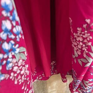 Beautiful dress, I absolutely love this color. A deep jewel tone magenta. This originally came with a sash to tie around the waist but it no longer has that (wasnt needed anyway) Its in great condition, worn once. Smoke and pet free home. Midi length. Not see through and comes with a removable liner dress underneath. Retails for $120. Polyester material.
