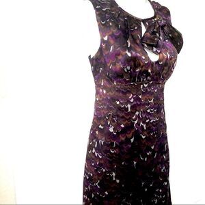 Beautiful colors! 100% silk. Made in USA. Worn only once. Zip back. Pit-pit=approx 17”, length from shoulder= approx 34” waist=approx 15”, hips approx 18”. Fully lined. Keyhole neckline. Removable bow