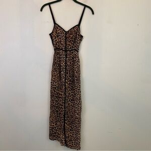 Abir dress by Nanushka. This bodycon leopard print dress is long and asymmetrical on the bottom. The fine shoulder straps are black and ajustable. The piece has a slit on the front and fine black pipings underlining.