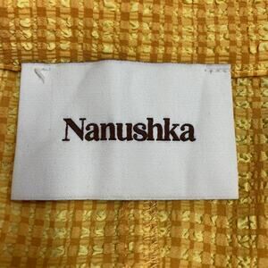NANUSHKA shirt in a yellow and brown polyester stretch blend seersucker featuring a plaid pattern, short sleeves, and button closure. Made in Hungary.