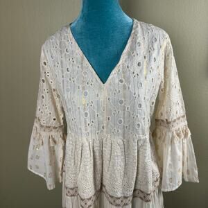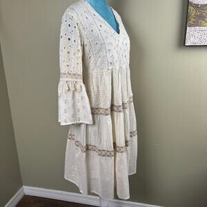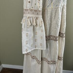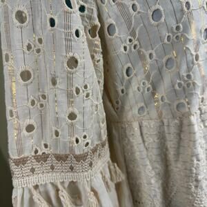 NAOO Women's size Small Ivory Gold Embellished 3 tiered peasant boho inspired fully lined dress with empire waist. Eyelets and embroidered. So many details! My FLAT measurements include 18" chest between axilla, 36" length. Thank you for your consideration of this beautiful dress by NAOO!