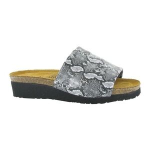 NAOT Alana Sandals, Cork Comfort Slides, Snakeskin Print, Gray, Women’s Size 11. New Without Tags. These store display sandals have some residue on the footbeds from the store stickers. The Naot Alana is a great basic slide sandal with animal print shiny fabric uppers. Naot's anatomic cork & latex footbed is wrapped in a pampering suede and molds to the shape of the foot with wear. Wear the Alana Sandal with your favorite dresses or wide leg pants. Elegant Collection features a 1.5 inch EVA sole.