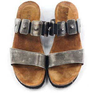 NAOT Ashley Silver Leather Rhinestones Low Wedge Slide Sandals Slip On Metallic Elastic Strap Comfort Shoes