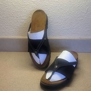Naot black thong style sandals. (sz US 6 EURO 37) The area that crosses over the top of the foot is elasticized for a good fit. Please see all pictures.