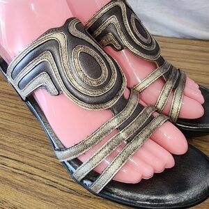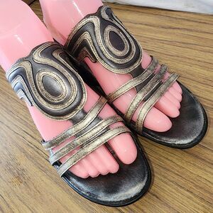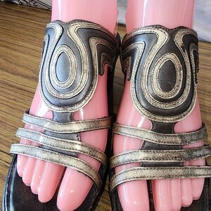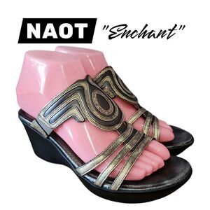 NAOT ENCHANT Sz 6/6.5 Metallic Gold Leather Small Wedge Slide On Boho Sandals