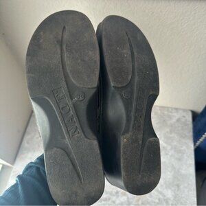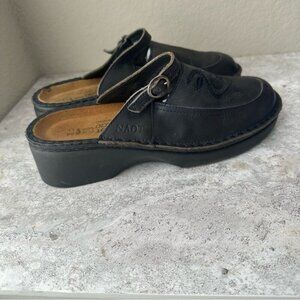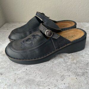 Stylish black leather clogs with unique embroidered design. Comfortable and chic. NAOT Navy Leather Slip-On Mules w/ Strap & Buckle – Women’s EU 38/ US 7
