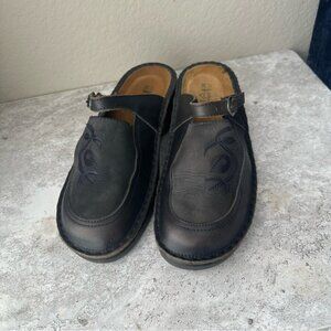 Stylish black leather clogs with unique embroidered design. Comfortable and chic. NAOT Navy Leather Slip-On Mules w/ Strap & Buckle – Women’s EU 38/ US 7