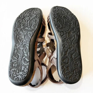 NAOT “Sara” made in Israel cork insole sandals women’s size 4 or EU 35. Taupe metallic leather with adjustable ankle strap. Preowned, like new condition. The perfect summer sandal and so comfortable!