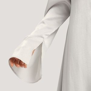 Classic tunic style and shirt gown with flat Johnny collar, V-neck button-front design, and long sleeves.