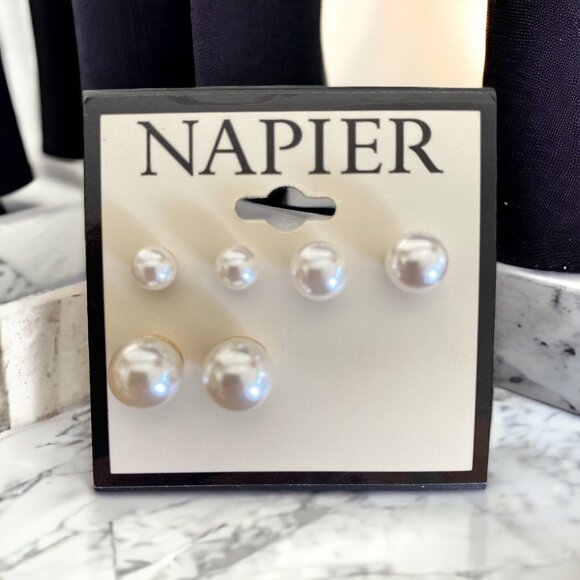 Elevate your style with these stunning earrings from Napier. This set includes three pairs of faux pearl ball earrings, each with a post back closure for comfortable wear. The round shape and classic stud style make them perfect for any occasion, whether you're dressing up or keeping it casual. The elegant pearl color adds a touch of sophistication that will complement any outfit, and the absence of a main stone gives them a versatile look that can be paired with anything. These earrings are new with tags, ensuring their quality and authenticity. Add them to your jewelry collection today!