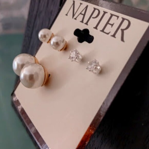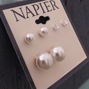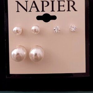 ONLY **2** SETS LEFT!!! NEW!!! NAPIER 3pc SET Contemporary Gold White Pearl/Clear CZ Stone Stud Earrings**Set Includes 3 Pairs of Stud Earrings~2 Pairs of Faux White Pearl with Gold Cradle (Behind the Pearl) Stud Earrings + 1 Pair Round Clear CZ Stone Stud Earrings! Lovely Set to add to your Jewelry Collection!**Earrings have Post Backs**NEW ON HANG TAG!