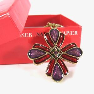Vintage Napier maltese cross key ring with rhinestones and the original box, c.1990's. It has a horseshoe shaped ring with screw ball ends for easy key additions. The cross is 1 7/8" and is two-sided. Both sides are basically the same, but one has rhinestones and the other is plain.
