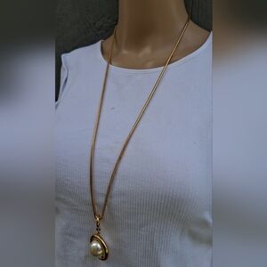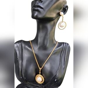 This elegant vintage Napier necklace and earrings set features lustrous faux pearls set within polished gold-tone rings, offering a classic and sophisticated look. The necklace boasts a long sleek snake chain with a prominent pearl pendant, while the matching earrings feature a similar design, perfect for adding a touch of timeless charm to any outfit. This set is ideal for both everyday wear and special occasions. Necklace measures 30-1/2 inches in length and earrings measure just over 2 inches tall. Set is in great condition