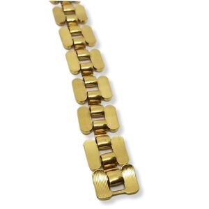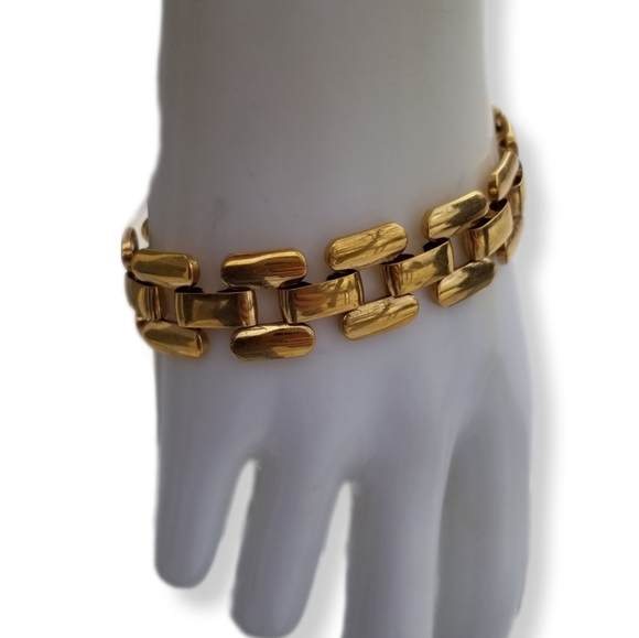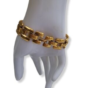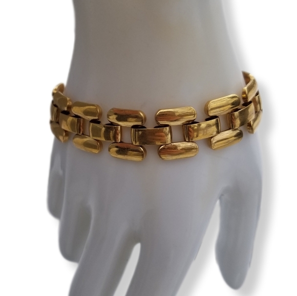 Chic vintage goldtoned bracelet by Napier has a sleek panther chain design. Bracelet measure 7-1/2 inches in length and 5/8 inch wide. Bracelet has a fold over clasp and is in great condition.