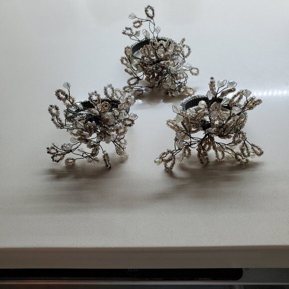 THIS IS A SET OF 3 NAPKIN RINGS. THEY FEATURE TINY SEED BEADS DONE IN WHITE AND SILVER ON THIN WIRES SO THEY CAN BE MOVED AROUND. THEY ARE IN VERY GOOD CONDITION.