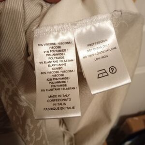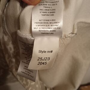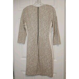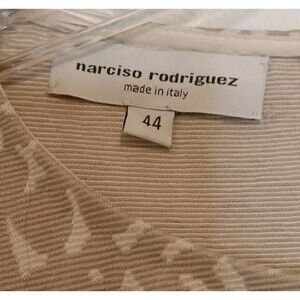 This is a designer Narciso Rodriguez bodycon dress in cream white with an animal print pattern. It features 3/4 sleeves and a long sleeve style, with a sheath silhouette and above knee length. Made from a knit fabric blend of 70% Viscose, 21% Polyamide, and 9% Elastane, the dress offers a stretchy and comfortable fit in size 8. Perfect for cocktail occasions, this stylish and chic dress showcases the designer's signature aesthetic.