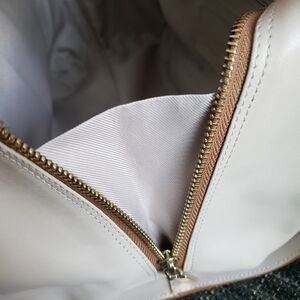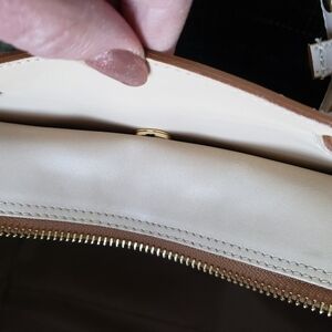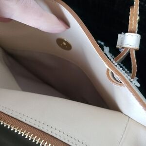 Long removable strap. zipper down the middle, two smaller snap pockets on each side and one zip pocket on the inside of the bag. This bag is gourgous, made in Italy. I added beautiful tweely and additional accents to make this