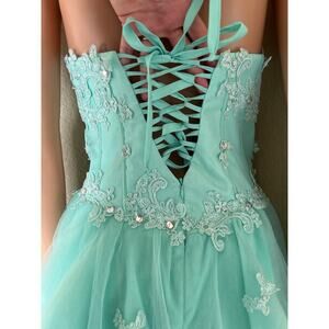 NARIANNA Tulle Prom Dress sea foam Green Lace up back Short strapless SZ SM corset style top embellished sequined jeweled