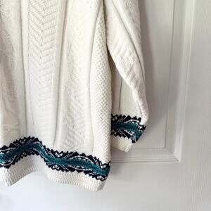 No size markings but can fit up to large depending on desired fit. Small or medium may be best for baggier look. See measurements. Deadstock from North America Sweaters NAS. Made in USA. White textured v neck and bottom lined black with green stripe Cottagecore style design. Also along sleeve cuffs. Preppy but girly.
