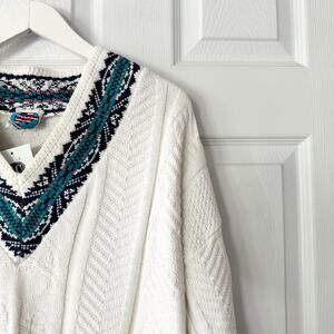 NAS North America Sweaters Deadstock White Green Lined V Neck Sweater Jumper OS