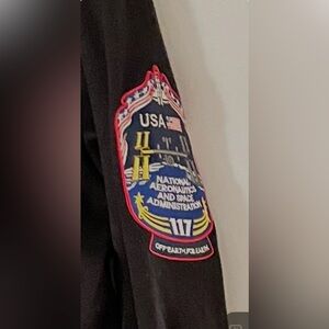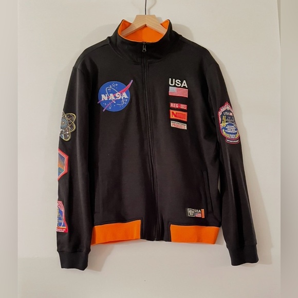 This item is a Hudson Outerwear NASA Full-Zip Sweatshirt. It is a black jacket featuring numerous silk and embroidered NASA-inspired patches on the front, back and sleeves