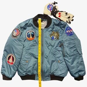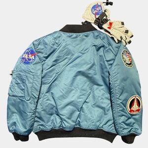 Blue NASA astronaut bomber jacket with multiple embroidered space mission patches on front, back, and sleeves. Includes matching NASA astronaut gloves as a bundle. Classic MA-1 style with ribbed collar, cuffs, and hem. Zip front with shuttle-shaped zipper pull. Utility sleeve pocket.