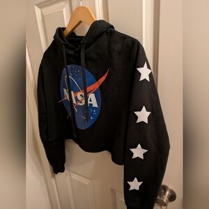love this hoodie but unfortunately it's a bit too small for me. star detail on sleeves and NASA logo on front. fleece lined, super comfy