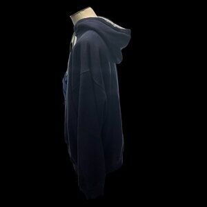 Navy blue hoodie with a light lining of soft fleece inside. Classic NASA "meatball" logo on front chest. 60% cotton, 40% poylester Machine wash cold with like colors, do not bleach and tumble dry low. Great condition.