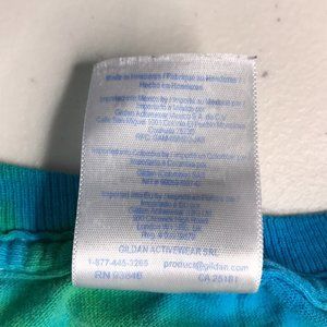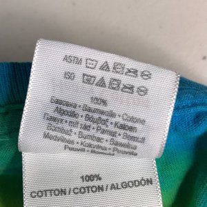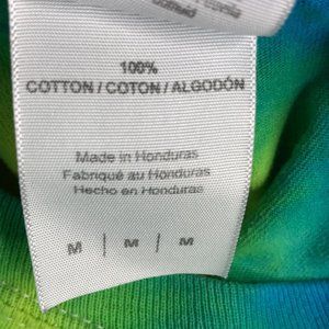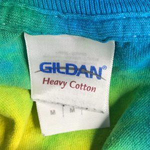 Has a hole at the shoulder and cracking on the graphic from regular wear. Nice psychedelic spiral tie dye multicolor shirt.
