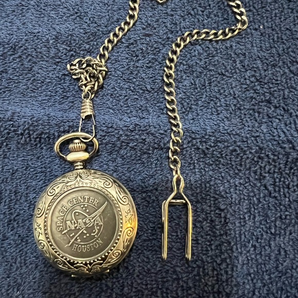 Elegant Space Center Houston pocket watch in a classic silver antique finish. Perfect for space enthusiasts and collectors. Quartz Vintage Collection. Has new battery and is working great.