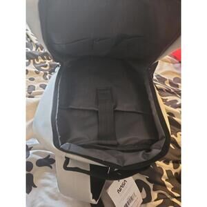 This unique NASA backpack features a striking white and black design with technical blueprint graphics of the Space Shuttle. The front of the bag is divided into two sections: one side showcases detailed schematics and mission text, while the other displays the iconic NASA 'worm' logo in bold vertical typography. Constructed from a durable, water-resistant synthetic material, this backpack offers a sleek, modern silhouette with a flat-profile design, making it ideal for carrying laptops or documents. It includes adjustable padded shoulder straps for comfort and a top carry handle. The item is brand new with the original NASA National Aeronautics and Space Administration tags attached, ensuring its collectible value and pristine condition. Perfect for space enthusiasts, students, or as a statement piece for urban techwear styles.