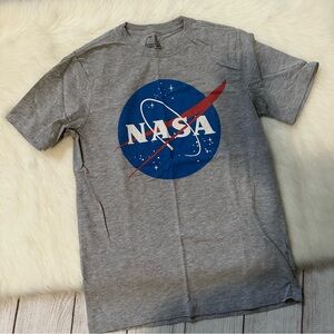 Size XS. Can fit a S. Has stretch. Gray color with nasa logo print on front. Has underarm discoloration as shown.