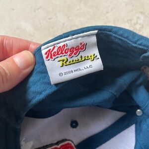 This NASCAR Kelloggs racing hat has a dark green bill and a dark blue cap. The Dale Jr signature is embroidered in white and the number 88 is embroidered in red. Kelloggs racing is embroidered on the back. Dated 2008