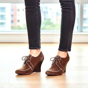 NASCAR Official Shoe brown suede lace-up high wedge pump. Stacked leather wedge heel is 3.5" tall. Leather sole.