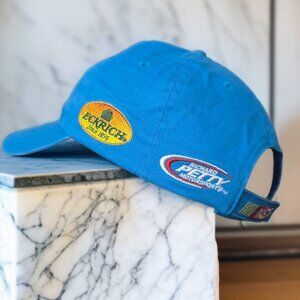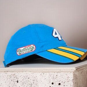 OSFA Features a Colorblock pattern in blue and yellow. Strap back and adjustable features for a comfortable fit.