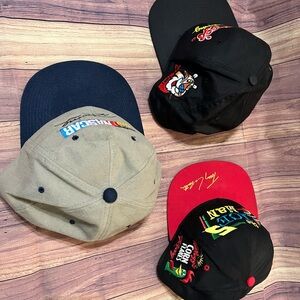 Set of three racing caps featuring NASCAR designs. Includes vibrant logos and embroidery.