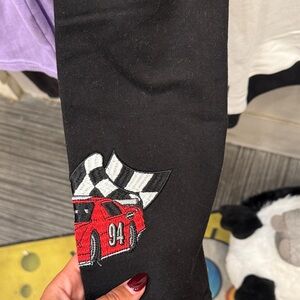 Black and white NASCAR Racing sweatshirt with bold graphics. Features racing patches on sleeves.