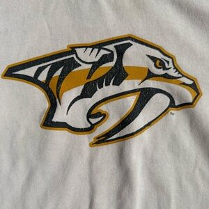 Gray and white Nashville Predators hoodie in a size small. This hoodie has a white base with gray colorblock details throughout. The hoodie has the Nashville Predators graphic on the chest. The hoodie has a navy blue elastic band at the hem and the wrists that has the words “Nashville Predators” circling it. It also features long sleeves, a kangaroo pocket and hood. The hoodie is in preloved condition. It is missing the drawstring to the hood, has creasing on the logo, and some of the Nashville Predator wording on the elastic bands has peeled off (see last three pics). The hoodie has been priced according to these flaws.